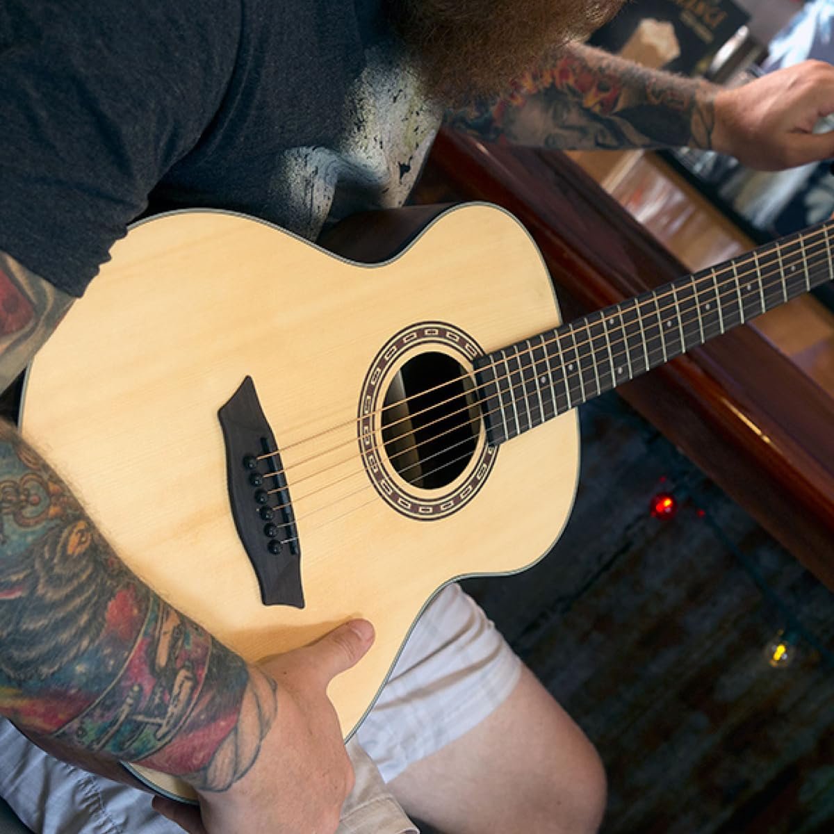 Grand auditorium shape and travel size make this acoustic Guitar The perfect choice for tone, resonance, comfort, and convenience