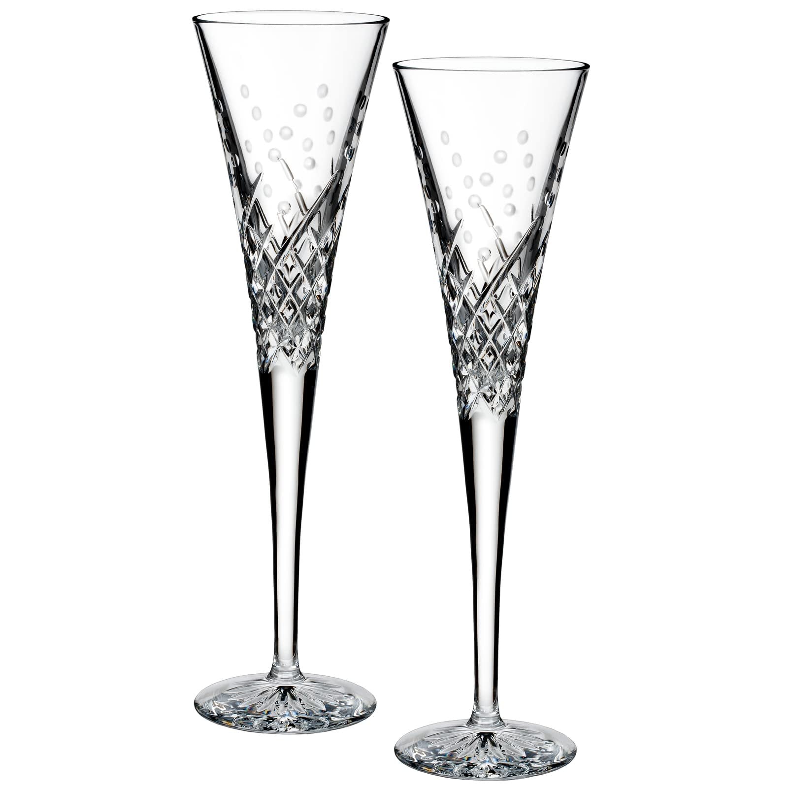 Honor your special occasion with our luxurious collection of crystal champagne flutes. This special Pair of Waterford Wishes Happy Celebrations Flutes is delicately engraved with patterns inspired by the bubbles of sparkling champagne