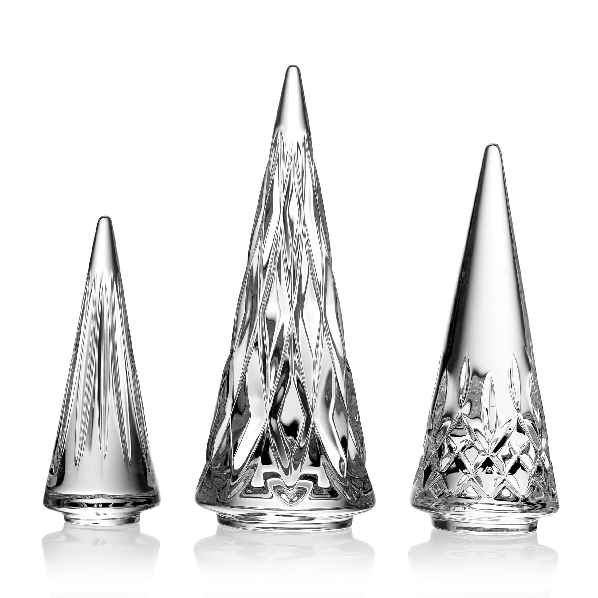 Waterford Standing Trees, Set of 3Part of the Waterford Festive CollectionCrafted from the finest CrystalThis beautifully designed set of 3 Crystal Christmas Trees will add sparkle to your holiday décor, while displayed on a shelf or tabletop. Perfect for gift giving, a thoughtful gift that will be treasured for year to come. Dimensions: Small Tree: 1.5 x 1.5 x 3.9", Medium Tree: 1.9 x 1.9 x 4.9", Large Tree: 2.4 x 4.4 x 5.9"Wash separately in warm soapy water , rinse thoroughly & dry with a lint free clothPresented in beautiful Waterford packaging