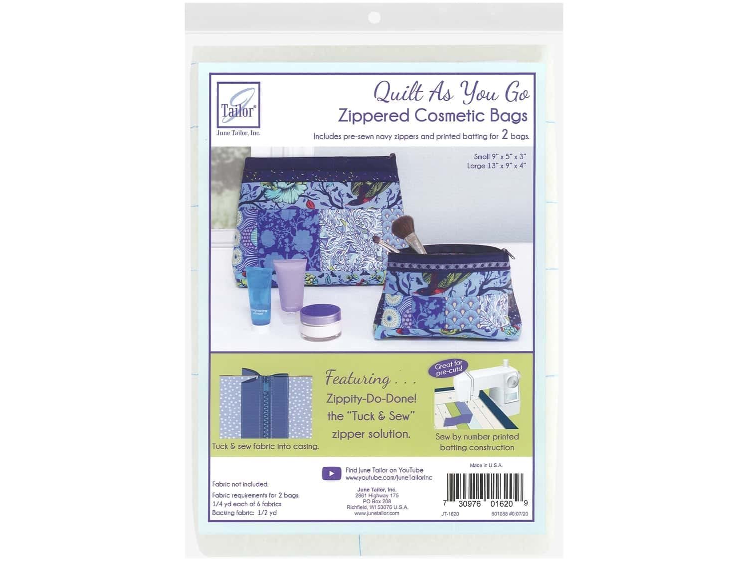 Zippity Do Done Cosmetic Bags (2) - Navy Zip, RedFun and easy Quilt As You Go, sew by number printed batting patterns combined with innovative new Zippity-Do-Done zippers to sew two fun cosmetic bags.Kit includes printed batting patterns for one small and one large cosmetic bag and two Zippity-Do-Done zippers in navy.Finished dimensions: large bag 13" x 9" x 4"; small bag 9" x 5" x 3"Great for use with pre-cut 2-1/2” strips and 5” squaresMade in the USA