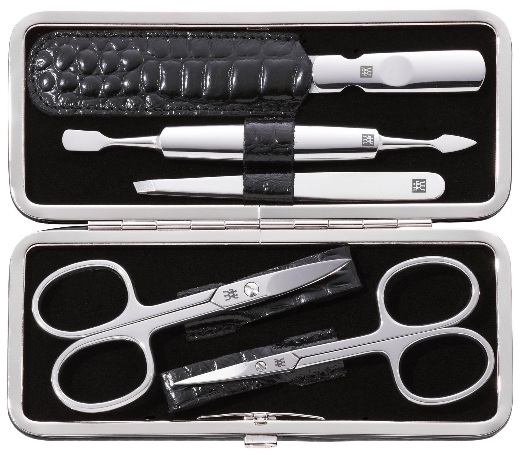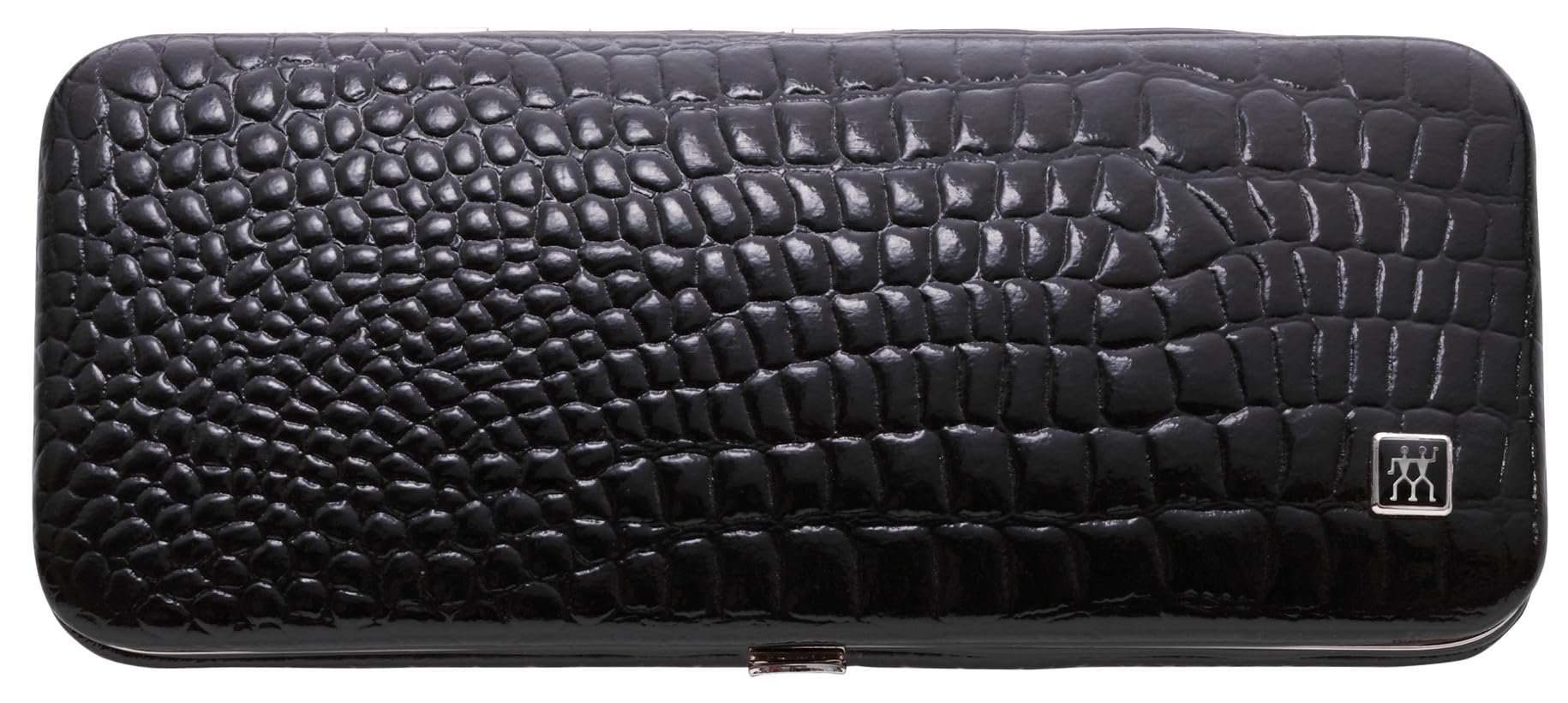 ZWILLING Beauty TWINOX Manicure and Pedicure Crocodile Pattern Cowhide Leather Case with Zip Closure, Nail Care Kit, 6-Piece, Premium Travel Nail Kit, Matte, BlackCOMPREHENSIVE NAIL CARE KIT: Cowhide leather 6-piece nail care set with our most popular and versatile instruments for your daily manicure and pedicure routine.IDEAL TRAVEL COMPANION: Travel nail kit keeps tools pristine with a metal framed black cowhide leather crocodile print case and velvet internal lining.ERGONOMIC DESIGN: Carefully designed ergonomic set makes for comfortable and easy grooming of hands and feet.ZWILLING PREMIUM QUALITY: Instruments are made from high-quality stainless steel with a corrosion resistant satin finish; all instruments are nickel free.PERFECT FOR GIFTING: Bring the nail salon to your home and on the road. Give the gift of beautiful manicures and pedicures to your loved ones for Christmas, Valentines Day, birthdays, and more!SET INCLUDES: Manicure and pedicure kit includes nail scissors, cuticle scissors, slanted tweezers, 2-in-1 cuticle pusher and under-nail cleaner, and a nail file.