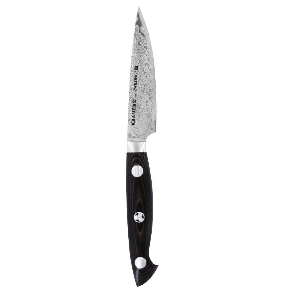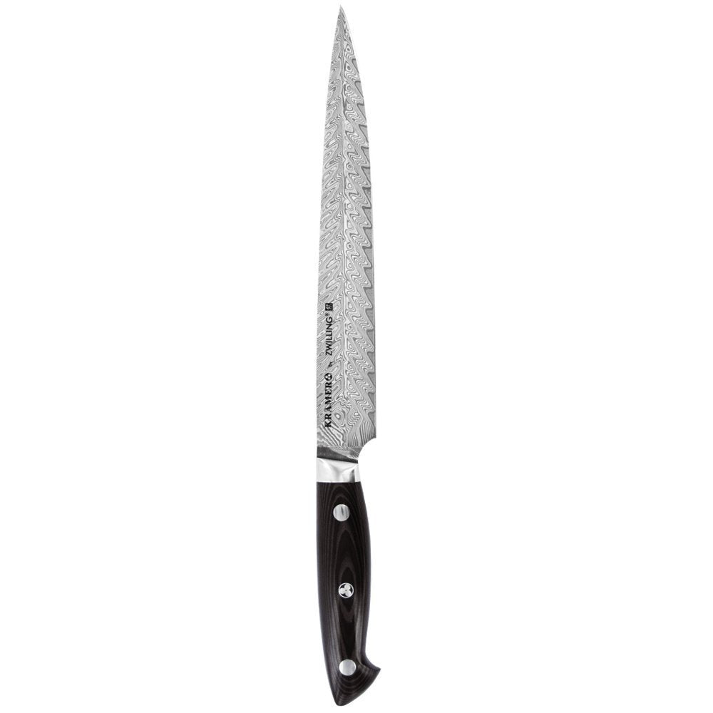ZWILLING KRAMER Knife Block Set, 7-pc, brown, EUROLINE Stainless Damascus CollectionIncludes 3.5" parer, 5" Utility, 8" chef, 9" slicer, 9" bread, 12" steel, blockSg2 (Mc63) micro-carbide powder steelDesigned to Master blade Smith Bob Kramer's exacting specifications